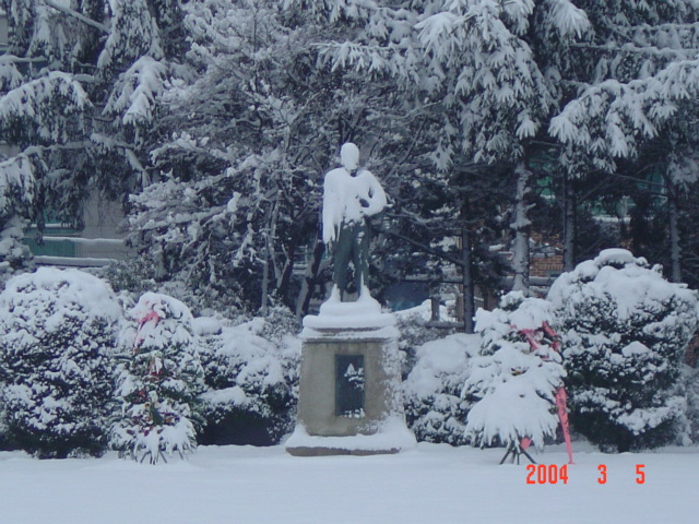 눈으로 덮힌 민영휘 선생님 동상 -