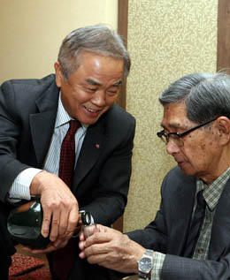 <P><FONT color=#0000ff>이날 모임은 어느 해 연말모임보다 각별했다. 선친 친구분들이 한 부사장에게 “9년동안 한결같은 효심에 고맙기 그지 없다”며 감사패를 만들어 전달했기 때문이다. <BR><BR>조주호씨는 “요즘 세상에 친부모도 아닌 아버지 친구를 이렇게 모시는 사람이 있겠나”며 “함께 모이는 날이 항상 기다려지고 친아들같은 상범이가 너무 고맙다”고 말했다. <BR><BR>한 부사장은 “이분들은 나의 선배이자 아버지같은 분”이라며 “한 분이라도 나오실 수 있는 한 자리를 이 모임을 계속할 생각”이라고 말했다. <BR><BR>한상범 부사장(좌)이 아버지 친구인 곽복록 전 한독친선협회장에게 술을 따라 드리고 있다. (사진) </FONT></P>'>