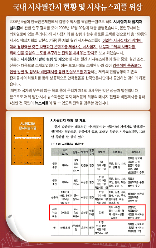 <P>제가 경영하는 월간 뉴스피플이 한국언론재단의 연구서 시사잡지와 잡지저널리즘 연구서에 4대 메이저로 소개되었습니다. </P>