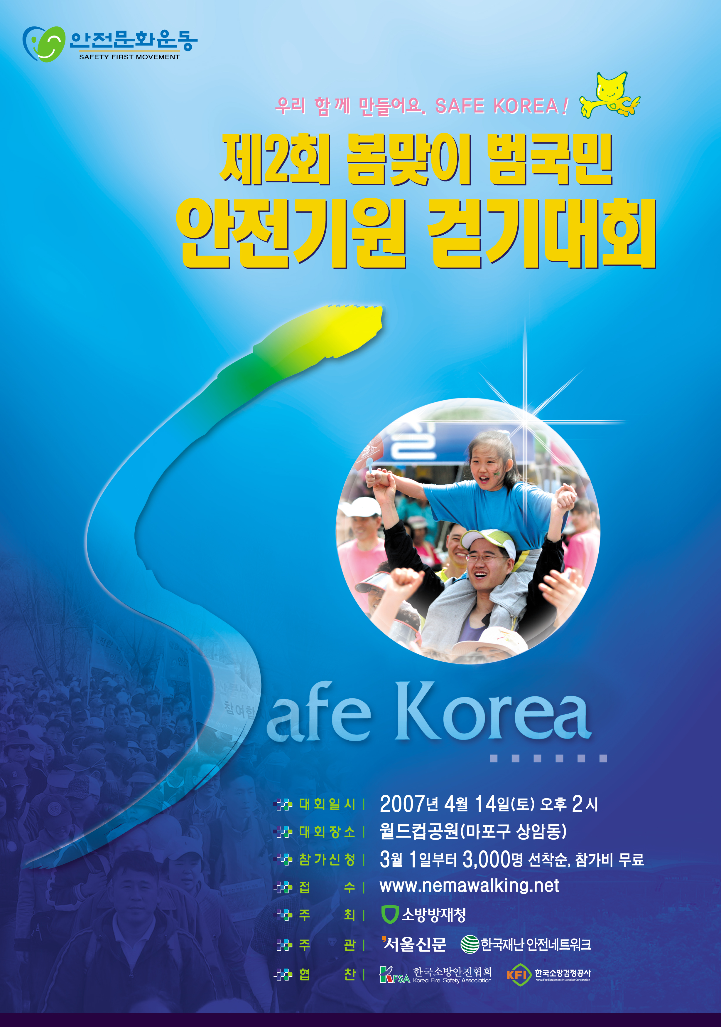 소방방재청에서는 따스한 봄을 맞이하여 모든 국민들이 각종 재난으로부터 보다 안전한 <BR>생활을 기원하기 위하여 상암동 월드컵 공원내에 위치한 평화의 공원에서 걷기대회를 개최합니다.<BR>현재 3천명 정도 사전 참가등록을 받아(www.nemawalking.net에서 신청) 4.14(토요일) 12:30부터<BR>식전행사로 휘문 67회 동문이 대표로 있는 이광호,송승환의 PMC프로덕션의 난타 문화공연과<BR>해병대의장대 및 풍물패 공연이 있고, 그외 부대행사로 대한간호협회 및 대한적십자 등의 협조로<BR>무료 고혈압 및 혈당 체크와 페이스페인팅,헬륨풍선,즉석사진 등 다양한 행사가 있습니다.<BR>본행사는 14시부터 5.8Km, 1시간 30분 정도 걷기 대회를 하고 16시 정도에 행사가 끝납니다.<BR>특히 참석한 분들께는 티셔츠,완보인증서,식수(아리수)와 추첨을 통해 많은 경품이 무료로 제공됩니다.<BR>기타 사항은 "봄맞이 범국민 안전기원 걷기대회" 관련 포스터을 첨부하니 참고 바랍니다.<BR>우리 동문들과 가족들이 많이 참여하여 건강도 챙기고, 난타도 관람하고, 안전한 생활도<BR>기원하고, 많은 경품도 챙기는 등 1石4鳥의 행운을 갖기 바랍니다. <BR>'>