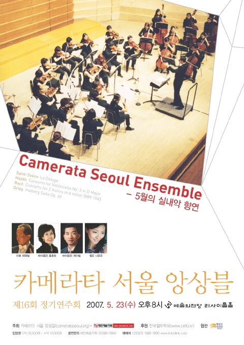 카메라타 서울 앙상블 제16회 정기연주회<BR><BR>지 휘 / 최영철 (카메라타 서울 앙상블 음악감독 겸 지휘자, 한국첼로학회장)<BR>협 연 /<BR>바이올린<BR>홍종화 (숙명여자대학교 교수) <BR>최인철 (관동대학교 교수)<BR>첼 로 나윤주 (경원대 출강, TIMF 앙상블 객원 단원)<BR><BR>카메라타 서울 앙상블은 1994년 창단이후 정통 클래식 연주는 물론 갤러리 콘서트, 병원 로비 음악회, 소외 지역 찾아가는 음악회 등 활발한 활동 등으로 지금까지 40여회 이상 연주회를 개최하였으며, 동호회 활동에 주력하여 전공자와 비전공자들 간의 거리를 좁혀 클래식의 대중화에 기여하고 있다. <BR>특히 앙상블 내 12인의 첼로 앙상블은 한국첼로학회(www.cello.kr)의 각종 연주와 교육, 운영을 담당하고 있다. 부설 첼로아카데미에는 전 세계에 걸쳐 1만여 회원이 있으며, 3천여 전공자와 7천여 아마추어가 서로 교류하며 각종 연주와 모임에 참여하고 있다. <BR>카메라타 서울(www.camerataseoul.org)은 2006년 국제 현악 클리닉을 개설하여 일본 등 외국과 광통신망을 이용한 화상교육으로 현악 연주자들에게 발생하는 문제점을 해결하는 프로젝트를 진행 중에 있으며 올해는 일본과 미국, 유럽 현지에서의 화상교육이 예정되어 있다. 또한 독일 자르란트 주에서 열리는 세계적인 페스티벌 Musik Saar 의 초청으로 독일, 룩셈부르크, 프랑스의 순회공연이 예정되어 있기도 하다. <BR><BR>금번 제16회 정기연주회는 구미 저명음대의 최고 학위를 마친 재능 있는 젊은 연주자들이 한 마음으로 모여 앙상블을 이루며, 음악계에서 활발하게 활동하는 솔리스트들과 함께 사랑과 감사의 달 5월에 신록으로 뒤덮인 예술의 전당에서 아름다운 하모니로 클래식 팬들에게 활기와 희망을 선사할 것이다.<BR><BR><BR>P R O G R A M<BR>Saint-Saëns (1835-1921) ........... Le Déluge <BR>F. Haydn (1731~1809) ............... Concerto for Violoncello No. 2 in D Major<BR>J.S. Bach (1685~1750) .............. Concerto for 2 Violins d minor BWV 1043<BR>E. Grieg (1843~1907) ................ Holberg Suite Op. 40<BR><BR><BR>2007. 5. 23(수) 오후 8:00 예술의전당 리사이틀홀 <BR>주 최 / 카메라타 서울 앙상블, 예인예술기획(02-586-0945)<BR>회원권 / S석 20,000원 A석 10,000원<BR>카메라타 서울 앙상블 정기연주회 2007. 5. 23(수) 오후 8시 예술의전당 리사이틀홀 예인예술기획 02)586-0945<BR><BR>지휘 / 최영철 <BR>* 경희대학교 음악대학 전 장학생 입학, 졸업<BR>* 쌍트 페테르부르크 국립음악원 (첼로, 지휘 복수전공), 그네신 국립음대 연주박사<BR>* 경희대 콩쿨 대상, 동아음악콩쿨 입상<BR>* 영국 로열필, 러시안 국립필 등 국내외 여러 교향악단과 협연 및 다수의 독주회 개최<BR>* JM World, 서울 체임버, KBS 교향악단 단원 역임<BR>* 구리시향 상임지휘자 역임, 루마니아 국립필, 블라디보스톡 방송필 등 객원지휘 다수<BR>* 경희대 음악연구소 연구실장 겸 수석연구원, KBS미디어 콘서바토리 주임교수 역임<BR>* 현재 : 카메라타 서울 음악감독겸 상임지휘자, 한국첼로학회장, 한국기독교향악단 상임지휘자<BR><BR>바이올린 / 홍종화<BR>* 예원, 서울예고 졸업 및 서울대 음대 재학 중 도미, 줄리어드 음대 및 동 대학원 졸업<BR>* 미국 International Music Program 오디션 선정 I.M.P 교향악단 독주자 및 악장으로 미국, <BR>유럽 순회 연주<BR>* 링컨센터 Alice Tully Hall과 Paul Recital Hall에서 실내악 연주 및 독주회<BR>* 국내에서 다수의 독주회 및 서울시향, 수원시향 등 다수의 교향악단과 협연<BR>* 브람스, 베토벤 소나타 전곡 완주 및 앙상블 유림, 코리아 앙상블 등 다수의 실내악단에서 활동<BR>* 현재 : 숙명여자대학교 음악대학 교수<BR><BR>바이올린 / 최인철<BR>* 서울예고 , 경희대 음대, 독일 쾰른 음대 졸업 <BR>* 슬로바키아 국립방송교향악단, 대전, 춘천(교향악축제), 강릉 시향 등 국내외 교향악단과 협연 <BR>* 유망신예 연주자 초청 독주회, 젊은 음악가 초청 독주회(예술의 전당 주최) 등 다수의 독주회<BR>및 실내악 연주 <BR>* 현재 : 관동대학교 교수 <BR><BR>첼로 / 나윤주<BR>* 예원, 서울예고, 서울대 음대 졸업<BR>* Mannes 음대 석사, 뉴욕 주립대 연주학 박사(DMA) 취득<BR>* 이화경향콩쿨 1위, 육영콩쿨 1위, Artists International Audition 입상<BR>* Carnegie Hall, Merkin Concert Hall, Donnell Library Center Auditorium, Town Hall, <BR>Middlebury College 등에서 독주회와 실내악 연주<BR>* Banff International Music Festival, Sarasota Music Festival 초청연주 및 Master class 참가 <BR>* 현재 : 경원대 출강, TIMF 앙상블 객원 단원