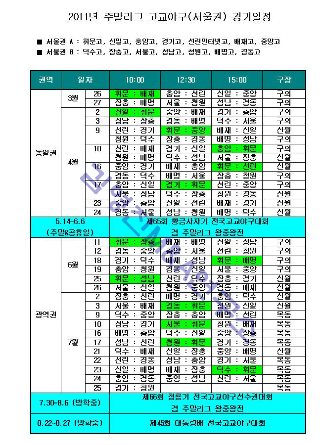 - [2831] 김영진 2011년 주말리그 고교야구(서울권) 경기일정 : 수정본 2011-03-28