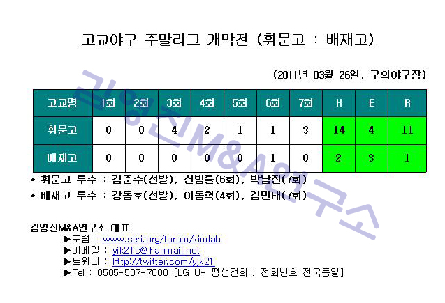 2011년 주말리그 고교야구 개막전에서 우리 휘문고 야구부가 배재고에 11대 1로 7회 콜드게임勝 했습니다.