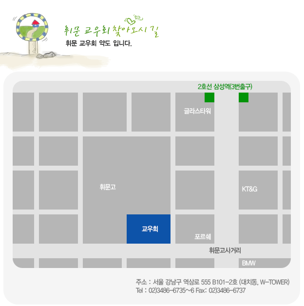휘문교우회 사무실: 서울 강남구 역삼로 555(대치동, W-TOWER B101-2호)