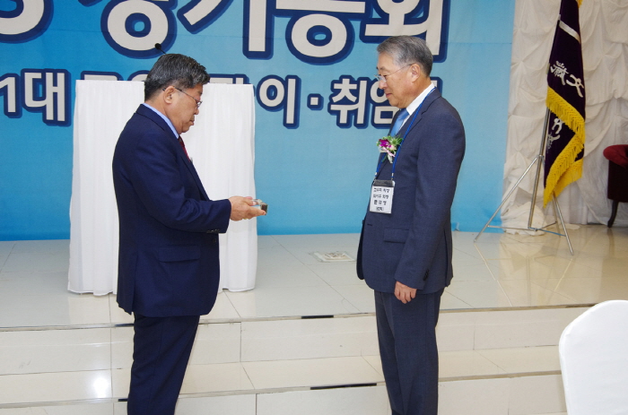 물러나시는 문규영 전임 회장님께 신임 최창순 회장님께서 감사패 증정