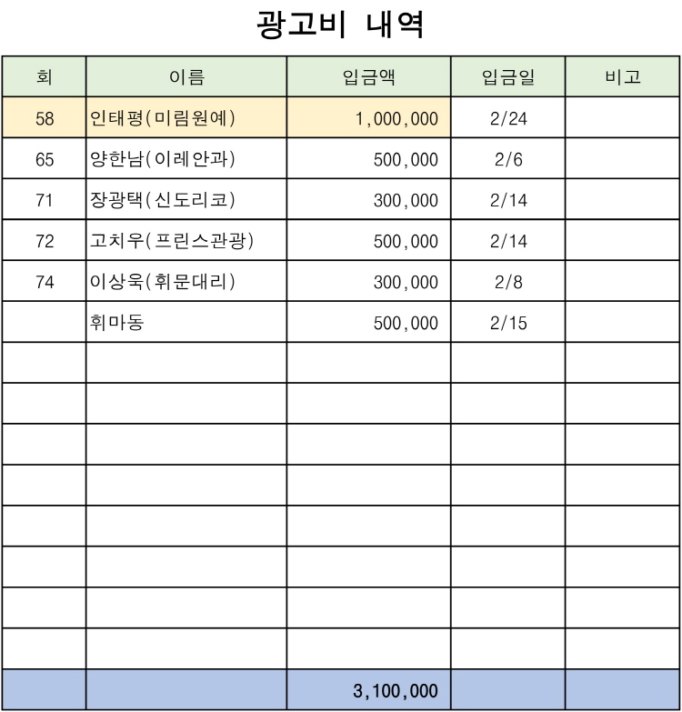 ‘개교 111주년 휘문 문화예술제’의 찬조금 내역 및 티켓 내역, 광고비 내역을 올립니다.