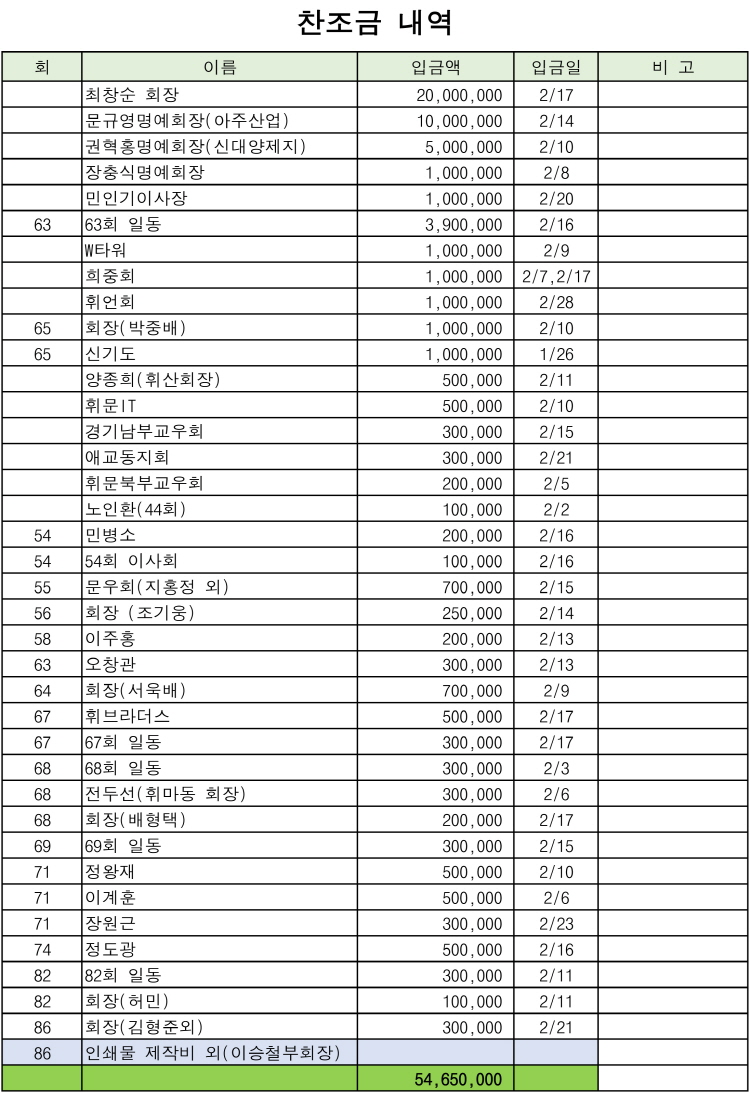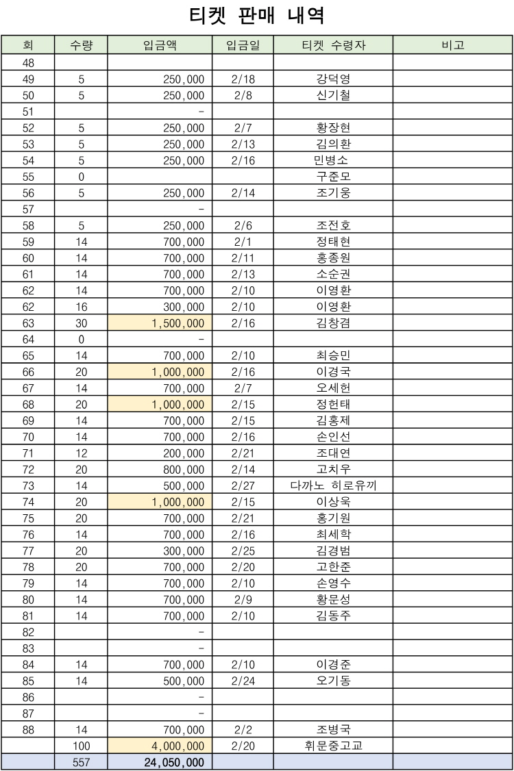 '개교 111주년 휘문 문화예술제' 찬조금 및 티켓 판매 내역