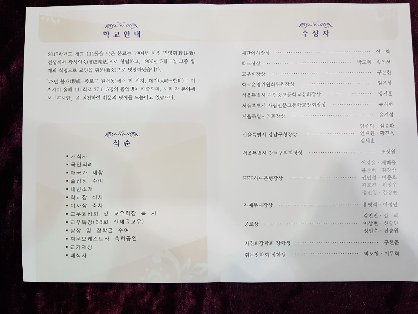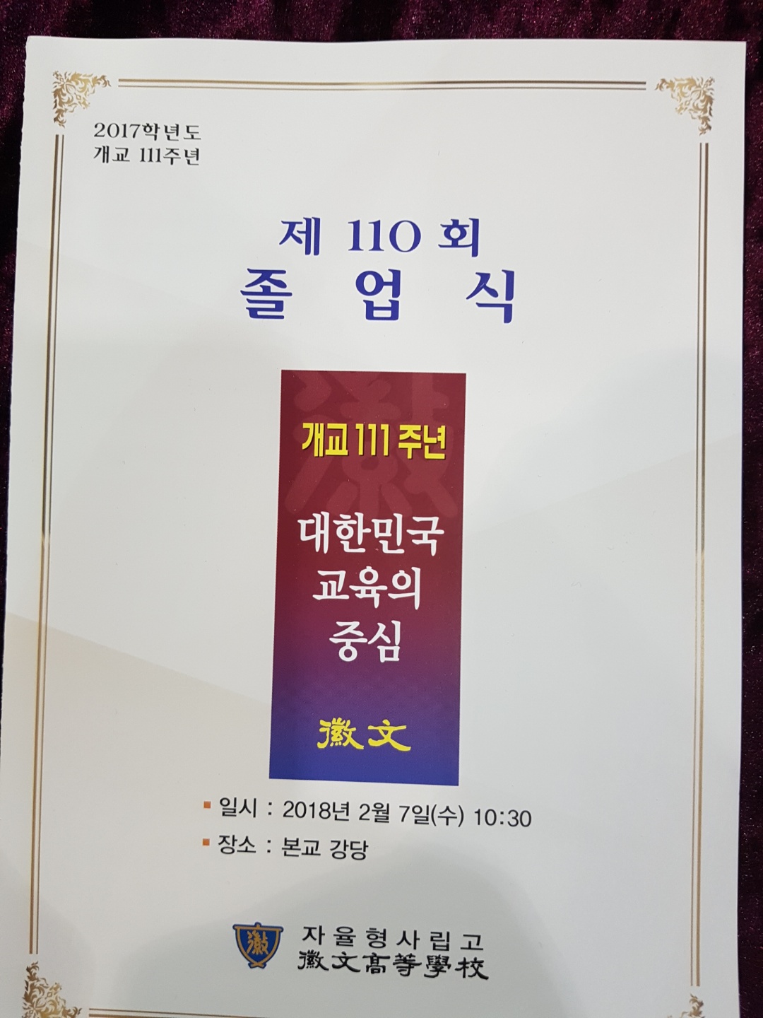 모교 휘문은 제 110회차 졸업생을 배출하였다.