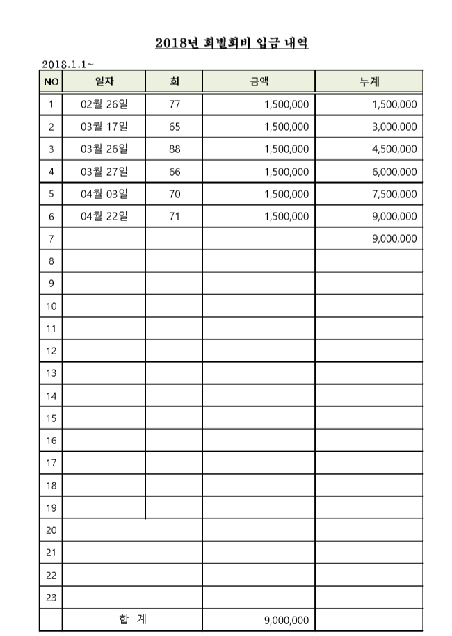 2018년 1월~4월까지 회비 입금현황