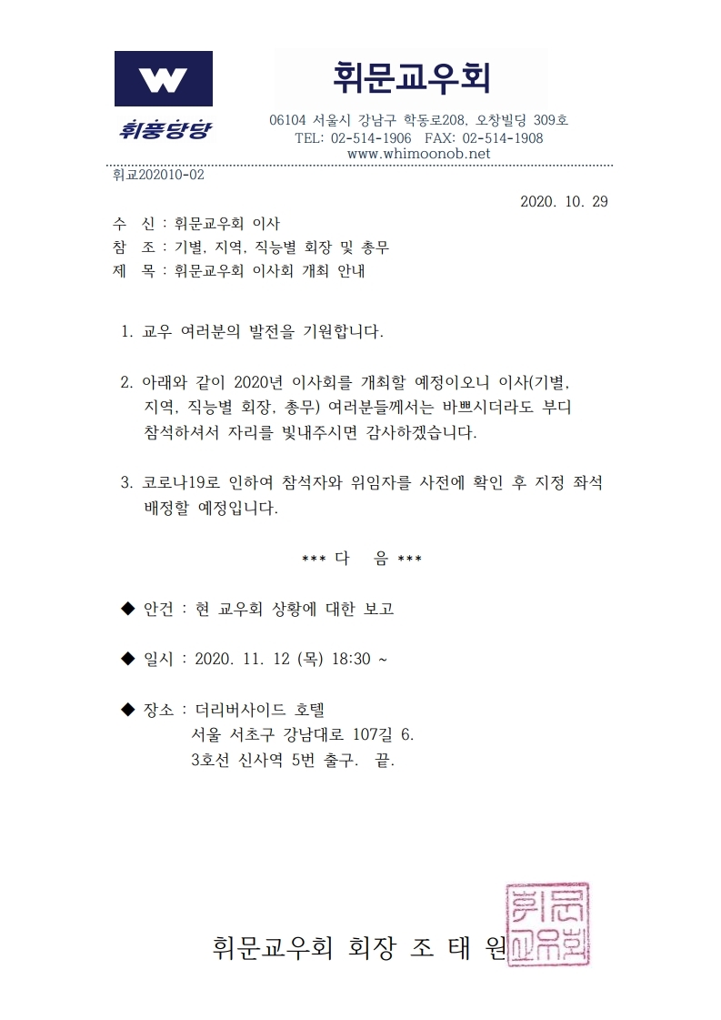2020. 11. 12 이사회 개최 안내