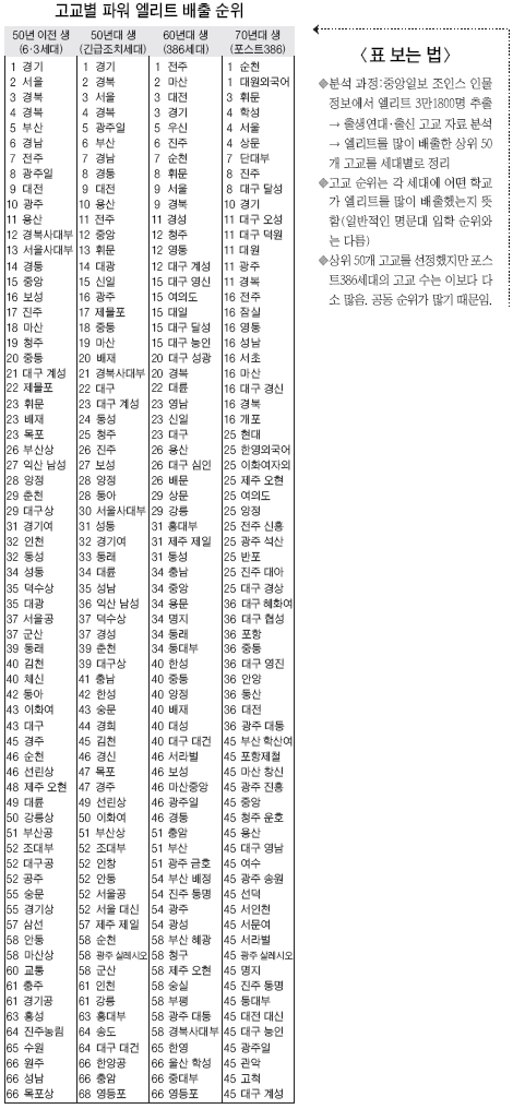 <P>과거의 전통을 이어오면서....</P> <P>현재와 미래에도  빛나는 전통을 이어 나가고 있는 학교야 말로</P> <P> 진정한 명문고등학교입니다...</P> <P>5,60년대 전국 최고의 명문고등학교였던 </P> <P>서울의  5대 국립인 ( 경기고, 서울고, 경복고, 경동고, 용산고.)와 </P> <P> 5대 사립인 (휘문 중앙 배재 양정 보성)</P> <P>그리고 지방의 명문 고등학교 였던 </P> <P>경북고 부산고, 경남고, 대전고 ,광주일고, 전주고 중에서</P> <P>현재에도 그  전통을 이어 나가고 있는 학교는</P> <P>대한민국에서  경기고 서울고 휘문고 입니다..</P> <P>신설된지 얼마 안되는 외국어 고등학교나 , 과학고등학교</P> <P>비평준화 지역인 지방고등학교에서  </P> <P>그 지역의 인재를  싹쓸이 한 덕분에 갑자기 등장한 학교들은....</P> <P>진정한 명문이라고  할 수 는 없을 것입니다</P> <P> </P> <P>위에 자료중에 대한민국 사회의 중추가 될 </P> <P>70년대 세대의 파워 엘리트 배출자료를 보면...</P> <P>비평준와 지역에서 갑자기 등장한 순천고와</P> <P>특수 목적고인 대원외국어고를 제외하면</P> <P>우리 휘문고가  전국 최고 입니다</P> <P> </P> <P>휘문동문들의  학교를 사랑하는 끈끈한 교우애나</P> <P>사회 각계각층의 다양한 진출도를 본다면</P> <P>그 차이는 더욱 벌어질 것입니다</P> <P>또한....</P> <P>같은 명문고등학교인</P> <P>강남 8학군의 경기고 서울고 상문고 영동고가</P> <P> 재학 인원이 많음에도 불구하고 </P> <P>우리 휘문이 파워 엘리트 배출면에서 앞선다는 것은 ...</P> <P>더욱 더 고무적인 일입니다...</P> <P> </P> <P>휘문의 재학생 여러분....</P> <P>휘문에 대한 무한한 자부심과 아울러...</P> <P>개인의 실력과 인간적인 겸손함을 갖추도록 노력하세요...</P> <P>여러분들은  대한민국 최고의 명문고등학교 학생들입니다....^^</P> <P> </P> <P> </P>'>